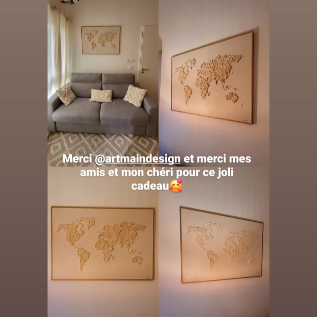 "Je réalise des tableaux en relief sur-mesure, célébrant la beauté du voyage et conçus avec des matériaux respectueux de l’environnement. Chaque pièce reflète élégance et délicatesse."